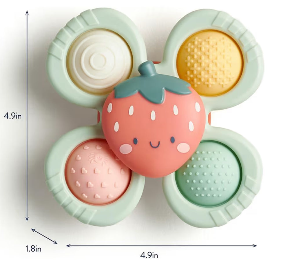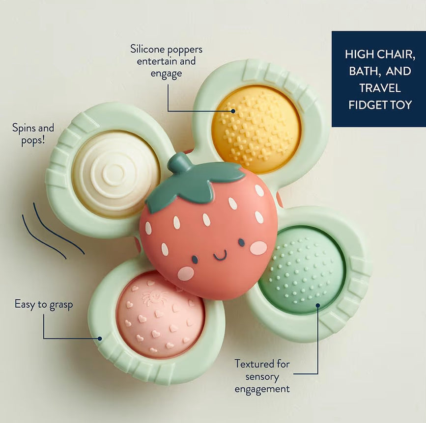 - SUCTION CUP BASE FOR STABLE PLAY: Designed for hands-on fun, the suction cup base keeps this fidget toy securely attached to smooth surfaces like highchairs, tables, and tubs. Babies can spin, press, and explore without it slipping away, making it a great addition to mealtime or bath time and perfect for on-the-go entertainment.