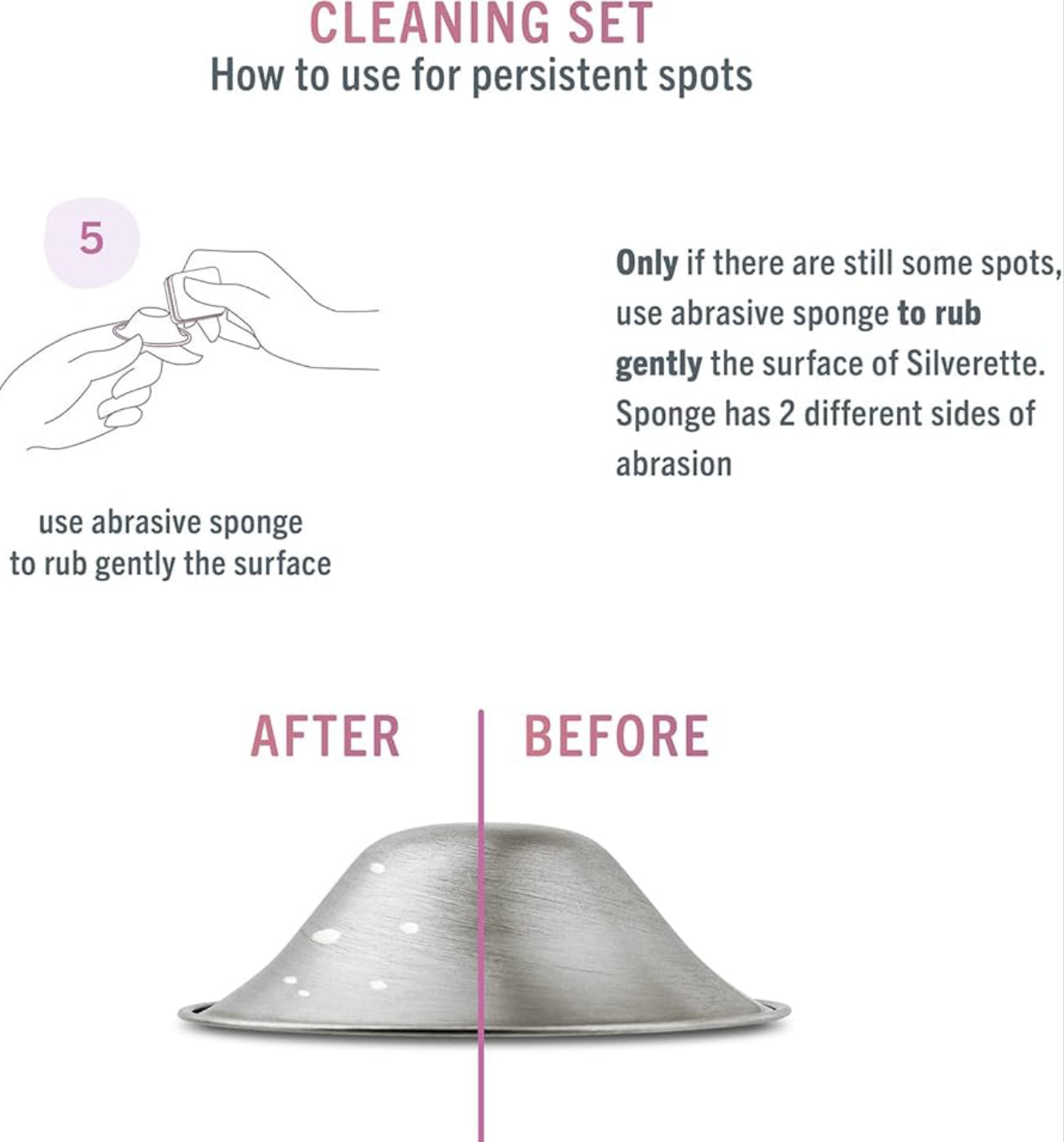 - Complete Cleaning Set: The SILVERETTE Original Cleaning Set includes everything you need to maintain your silver nursing cups: a 23g bottle of 100% baking soda, cotton gauze, an abrasive sponge, and a detailed instruction manual.